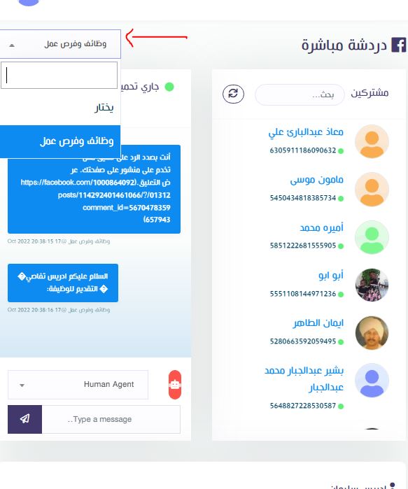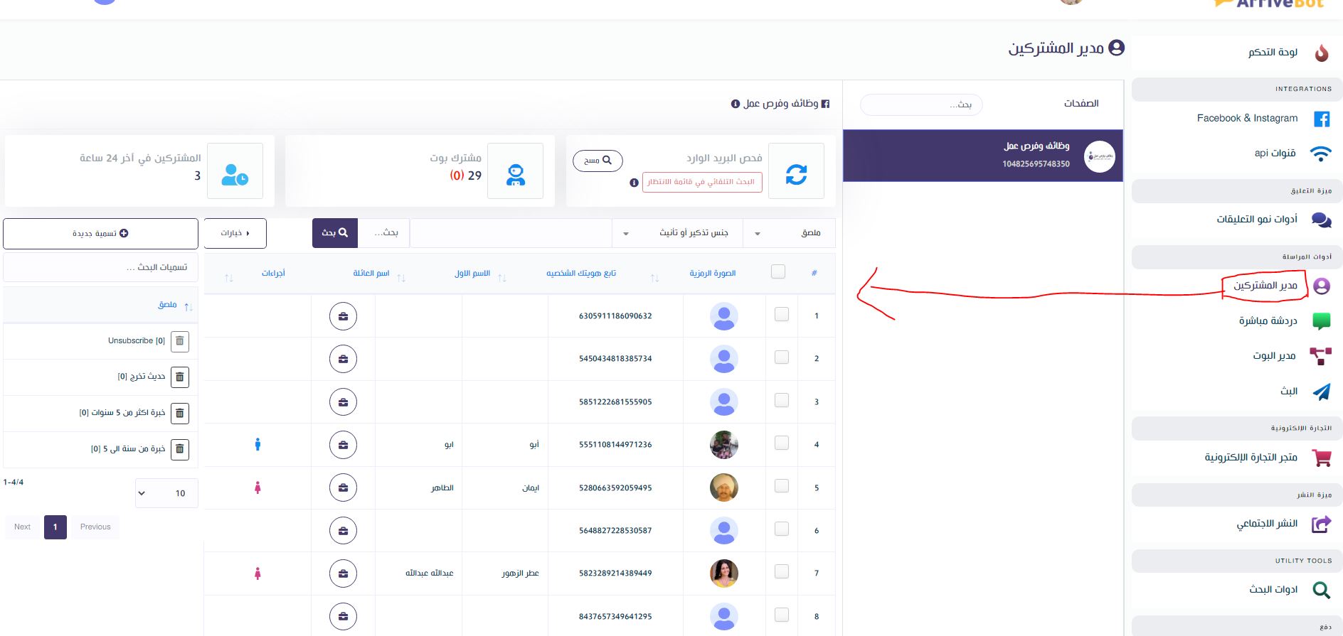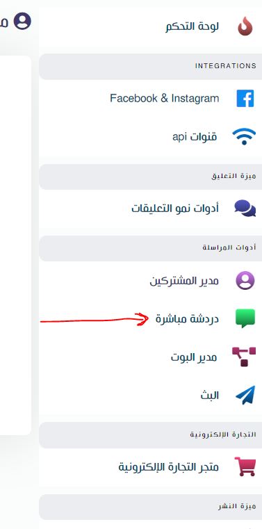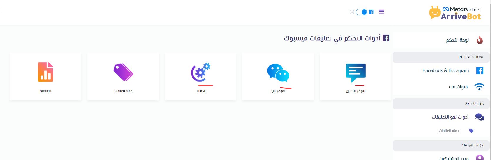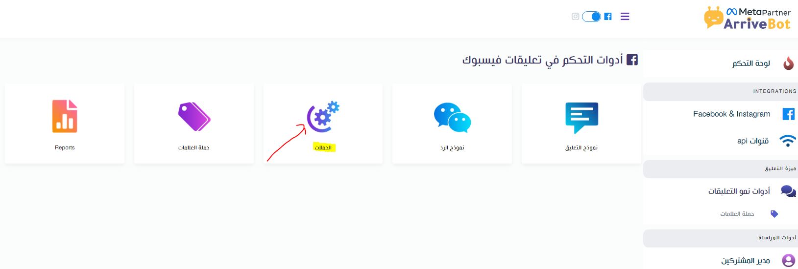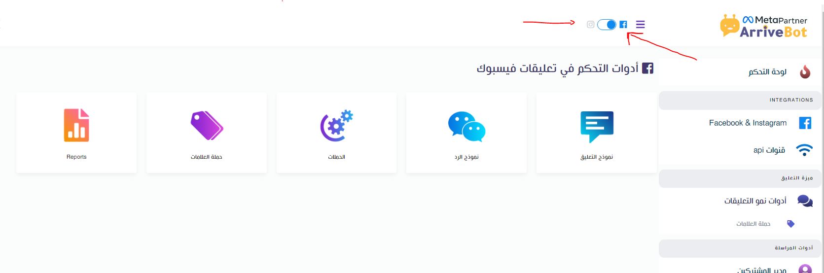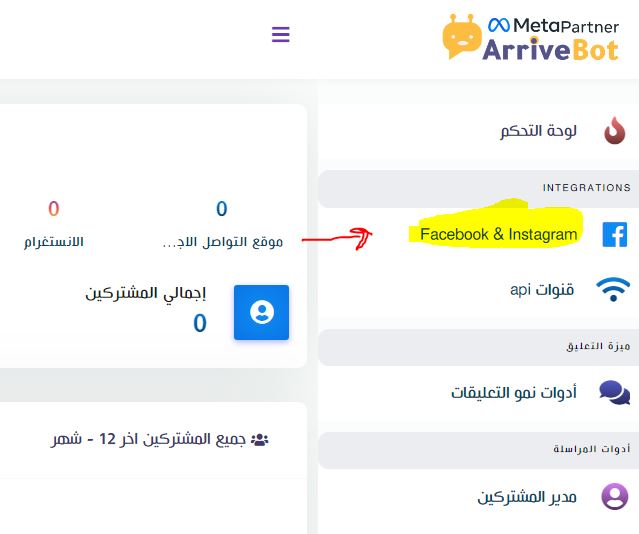 لاستيراد حسابات فيسبوك و انستغرام، أولاً، انتقل إلى لوحة التحكم في arrivebot في الشريط الجانبي الأيمن من لوحة التحكم، سترى قائمة تسمى "facebook & instagram". انقر فوق القائمة.