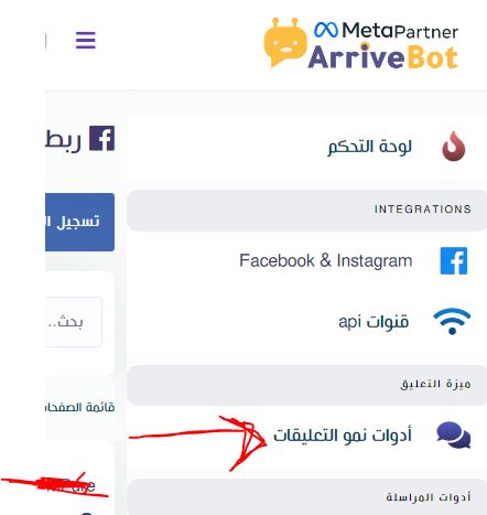 أولاً، انتقل إلى لوحة التحكم في Arrivebot. في اللوحة اليمنى من لوحة التحكم، سترى قائمة تسمى أدوات نمو التعليقات. انقر فوق هذه القائمة.