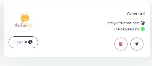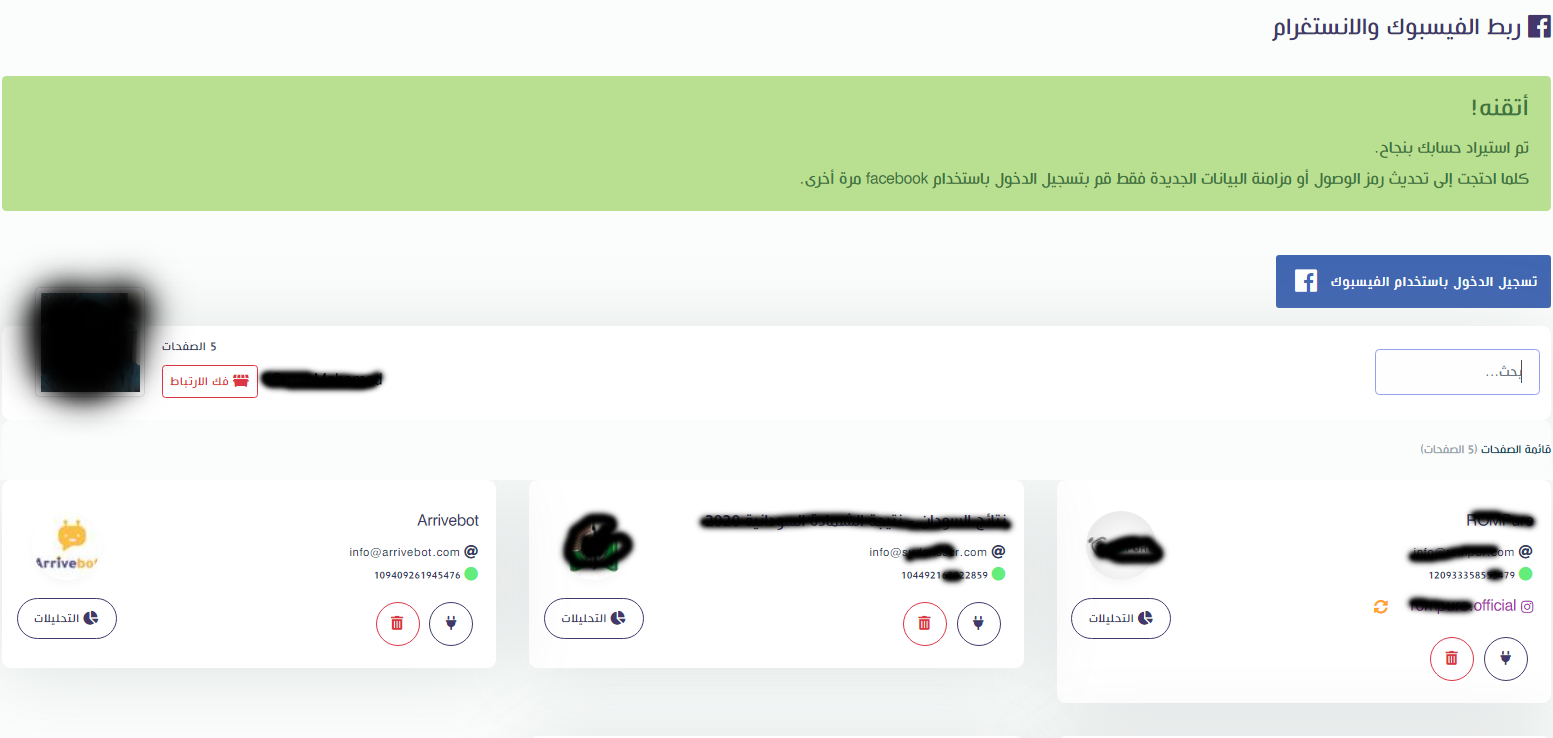 يمكنك أيضًا استيراد حساب آخر بالنقر فوق زر تسجيل الدخول إلى حساب آخر. انقر فوق الزر تسجيل الدخول إلى حساب آخر وستظهر صفحة تسجيل الدخول إلى فيسبوك. الآن قم بتسجيل الدخول باستخدام فيسبوك وسيتم استيراد الحساب إلى Arrivebot. على الفور، ستظهر صفحة ربط فيسبوك و انستغرام مع رسالة نجاح العملية معلومات بروفايل فيسبوك وصفحة فيسبوك. تحت صفحات فيسبوك، سترى زرين - زر التفعيل وزر الحذف.تفعيل اتصال البوت