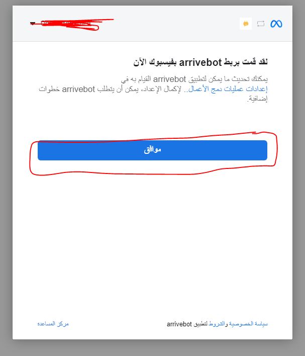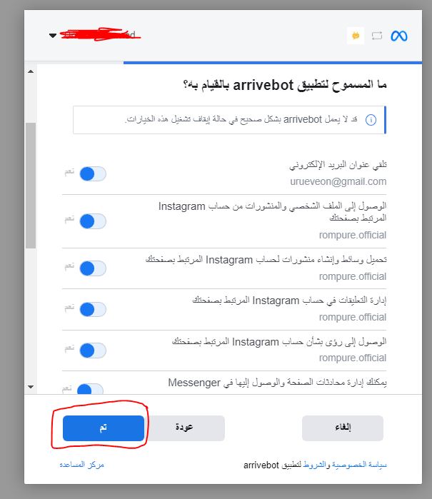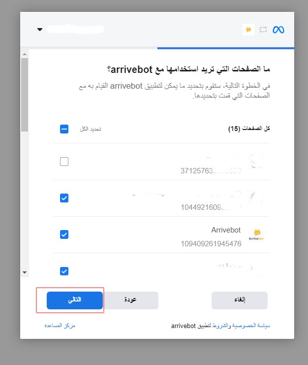 على الفور، سيظهر مربع حوار آخر في ملف تعريف فيسبوك. في مربع الحوار، يجب عليك تحديد صفحات فيسبوك التي تريد استخدامها مع Arrivebot. بالطبع، يمكنك تحديد عدة صفحات فيسبوك أو جميعها. ثم اضغط على زر التالي. على الفور، سيظهر مربع حوار. في مربع الحوار، يجب عليك تحديد ما يُسمح لمنصة Arrivebot القيام به. اترك بكل الخيارات مفعلة.ثم اضغط على زر تم. على الفور، سيظهر مربع حوار آخر يحوي رسالة مفادها أنك قمت الآن بربط Arrivebot بفيسبوك وزر موافق.