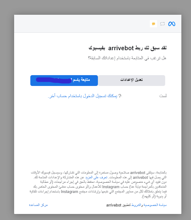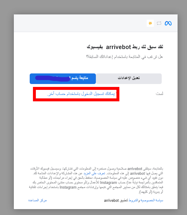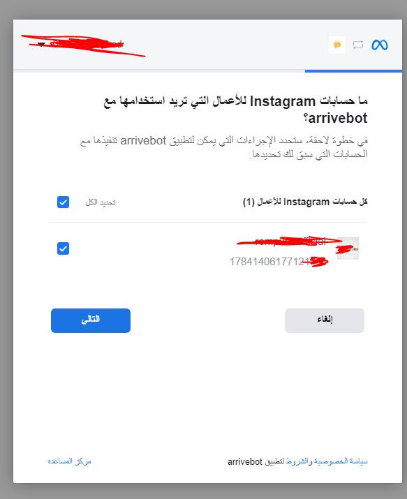 بمجرد النقر فوق زر تعديل الإعدادات، سيظهر مربع حوار لنفس بروفايل فيسبوك الذي تم فتحه في علامة تبويب أخرى في المتصفح. في مربع الحوار، يجب عليك تحديد حسابات أعمال انستغرام التي تريد استخدامها مع Arrivebot. بالطبع، يمكنك تحديد عدة حسابات أعمال على انستغرام أو جميعها. ثم اضغط على زر التالي.