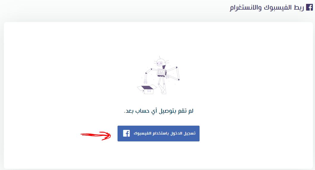 على الفور، ستظهر صفحة تسمى "ربط فيسبوك و انستغرام" مع زر يسمى "تسجيل الدخول عبر فيسبوك". لاحظ أنه لاستيراد حسابات فيسبوك و انستغرام، يجب فتح فيسبوك (تم تسجيل الدخول) في علامة تبويب أخرى في نفس المتصفح. حسنًا، انقر الآن على زر "تسجيل الدخول عبر فيسبوك".
