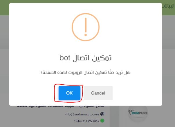 الآن عليك تفعيل اتصال البوت للصفحات. لتفعيل اتصال البوت لصفحة ما، انقر فوق زر التفعيل الموجود أسفل الصفحة.على الفور، سيظهر مربع حوار فيه زر "Cancel" و "OK". انقر فوق الزر "OK".
